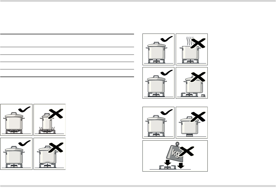 - Kogegrej, der udviser skader, har en uegnet størrelse, støder på kanterne af kogesektionen eller er forkert placeret, kan resultere i alvorlige læsioner. Overhold råd og vejledninger om kogegrej til madlavning.
