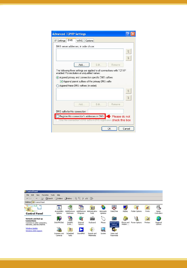 (5) Click [DNS] tab, unselect [Register this connection’s address in DNS], and