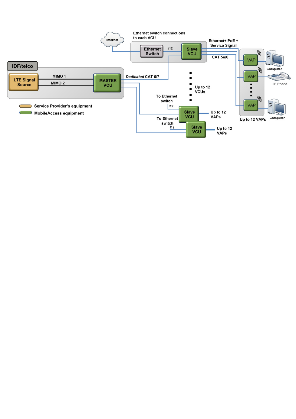The Master VCU distributes the wireless MIMO services from the service provider’s equipment to