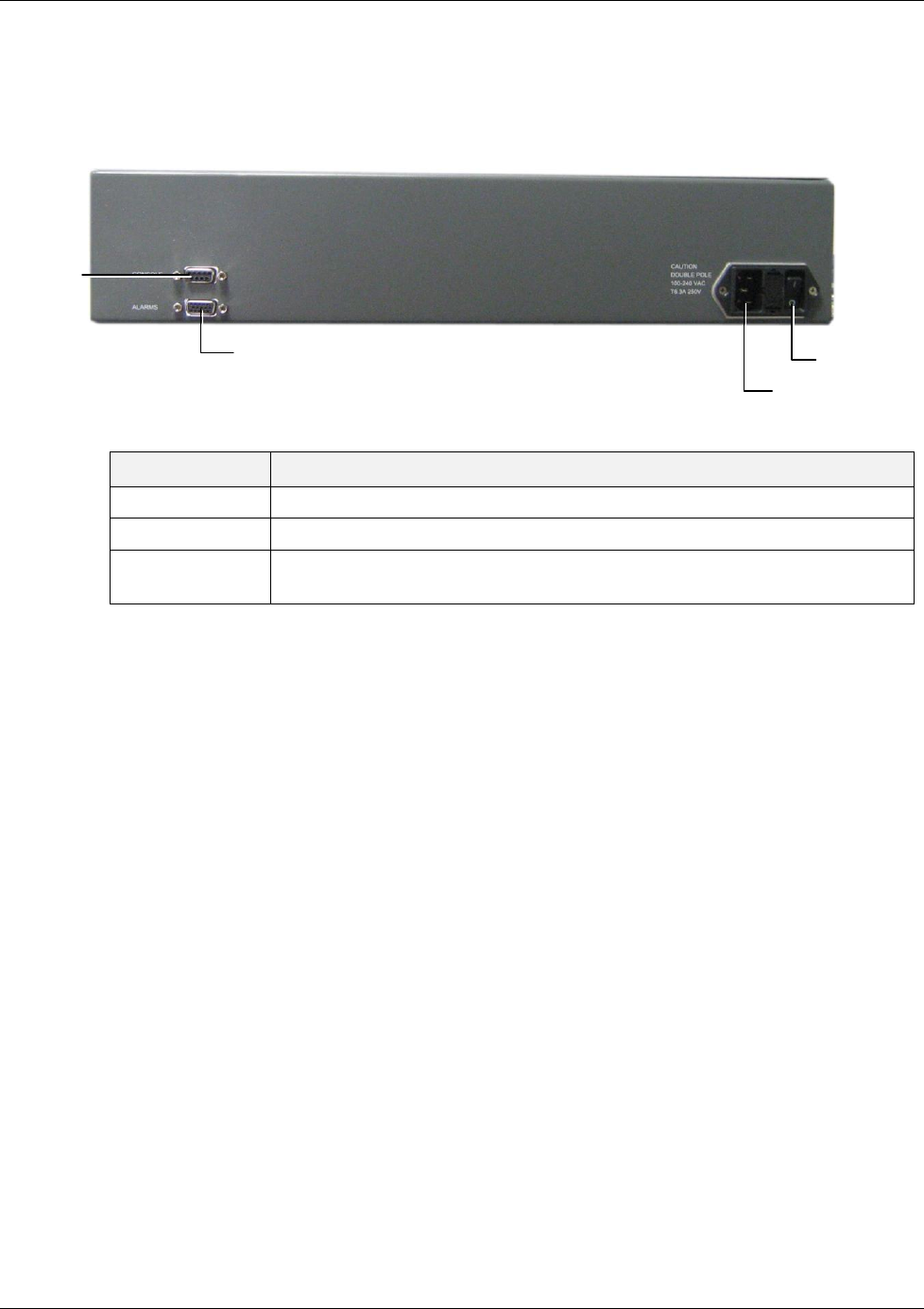 The rear panel includes the following: power switch, AC input, AUX alarms, and service