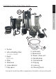 14 2 6 4 5 15 3 7 1 8 1. Empujador 2. Tapa y conducto de alimentación (contiene una 8. Vertedor de jugo 9. Microswitch 10. Unidad Base 11. Eje 12. Perilla de control 13. Jarra de la pulpa 14. Jarra del jugo 15. Cepillo de limpieza cuchilla) 3. Barrena (Libre de BPA) 4. Filtro 5. Base del filtro 6. Recolector del jugo 7. Vertedor de pulpa Su modelo específico puede diferir en apariencia de lo que se muestra en esta guía.