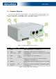 ICR-2701 1.2 Hardware Overview The router case preview is shown in Figure 1. A short description of hardware parts of the router is listed in Table 1, including the links to the chapters with a detailed description. For a router in a plastic box, the description of the components is similar. Figure 1: Hardware Overview of the Router # Item/Caption Type Description 1 LED - Status LED indication; see Chapter 2.5. 2 USB USB-A USB-A type socket connector; see Chapter 2.4.