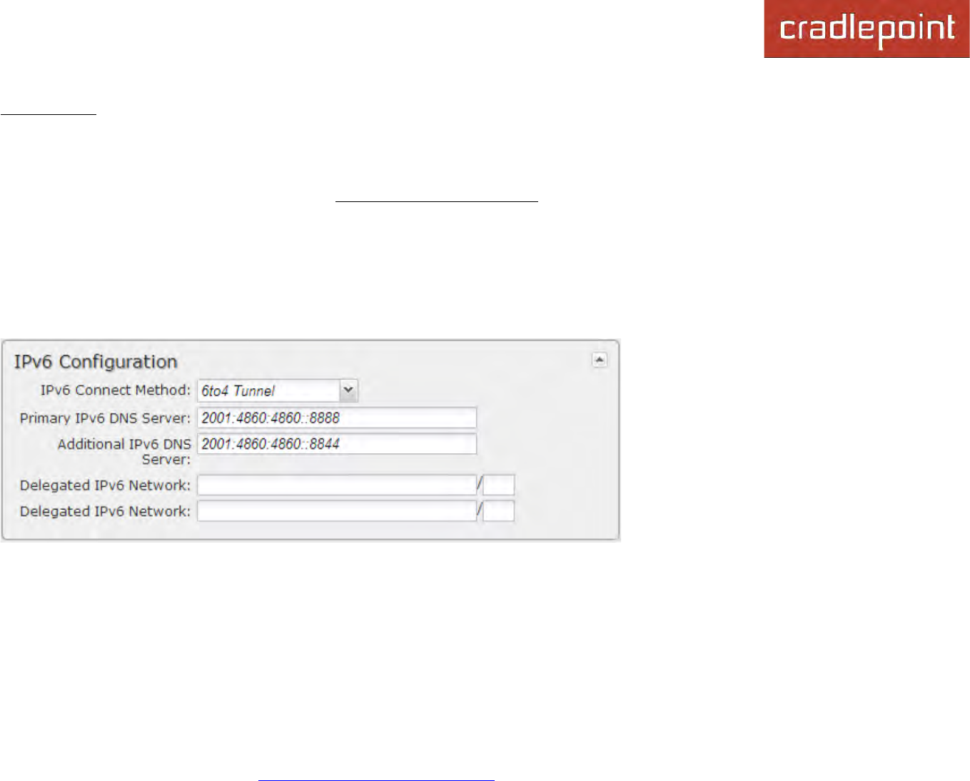 • Primary IPv6 DNS Server – (optional) Depending on your provider, this may be required. This only takes effect if