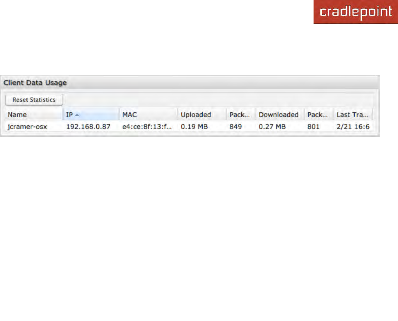 amount of data and number of packets downloaded, and when traffic was last sent or received for that client (“Last