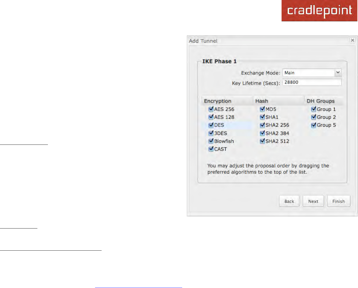 Encryption, Hash, and DH Groups: Each IKE exchange uses one encryption algorithm, one hash function, and one DH
