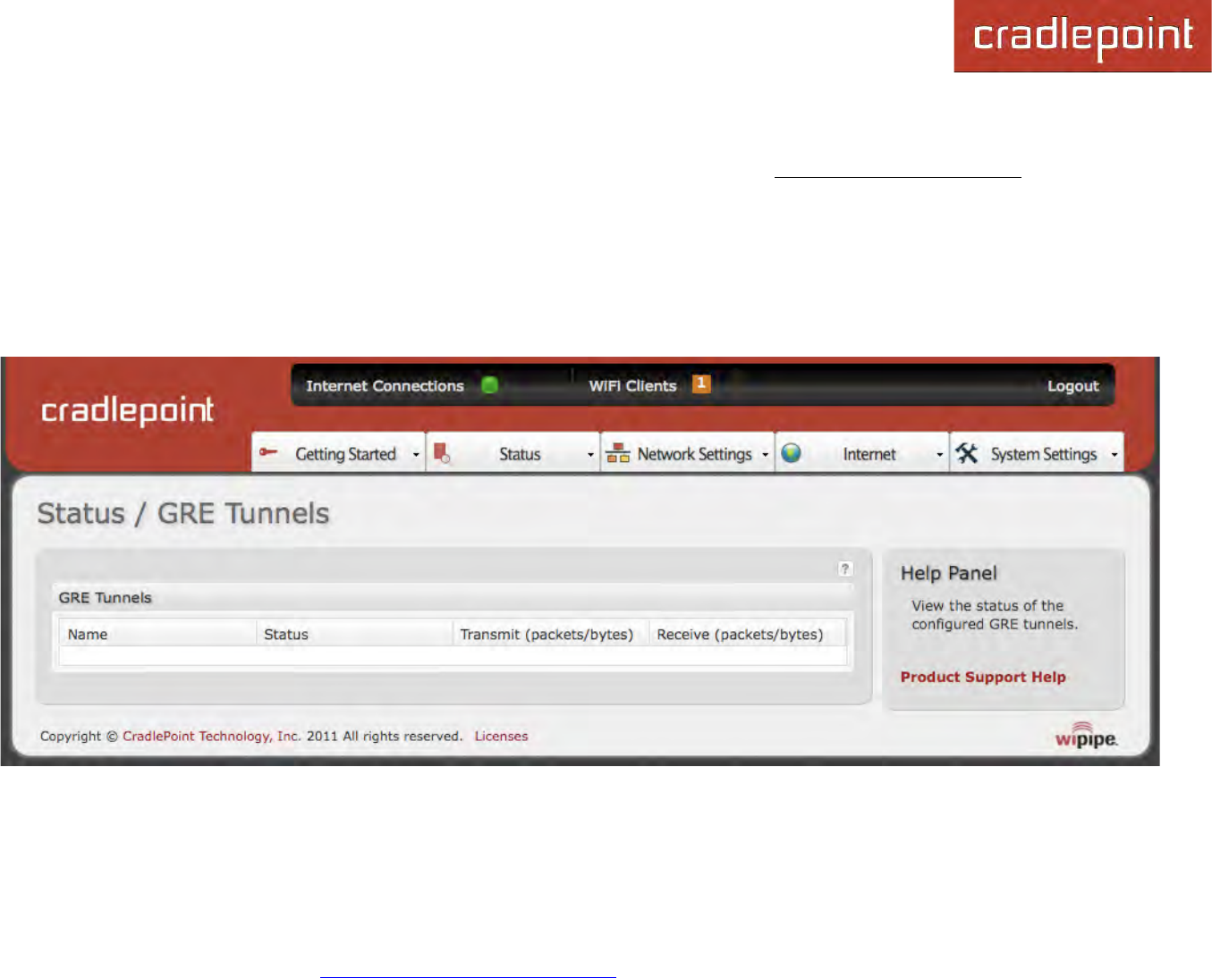 View the status of configured GRE Tunnels. To set up or edit a GRE tunnel, go to Internet → GRE Tunnels.