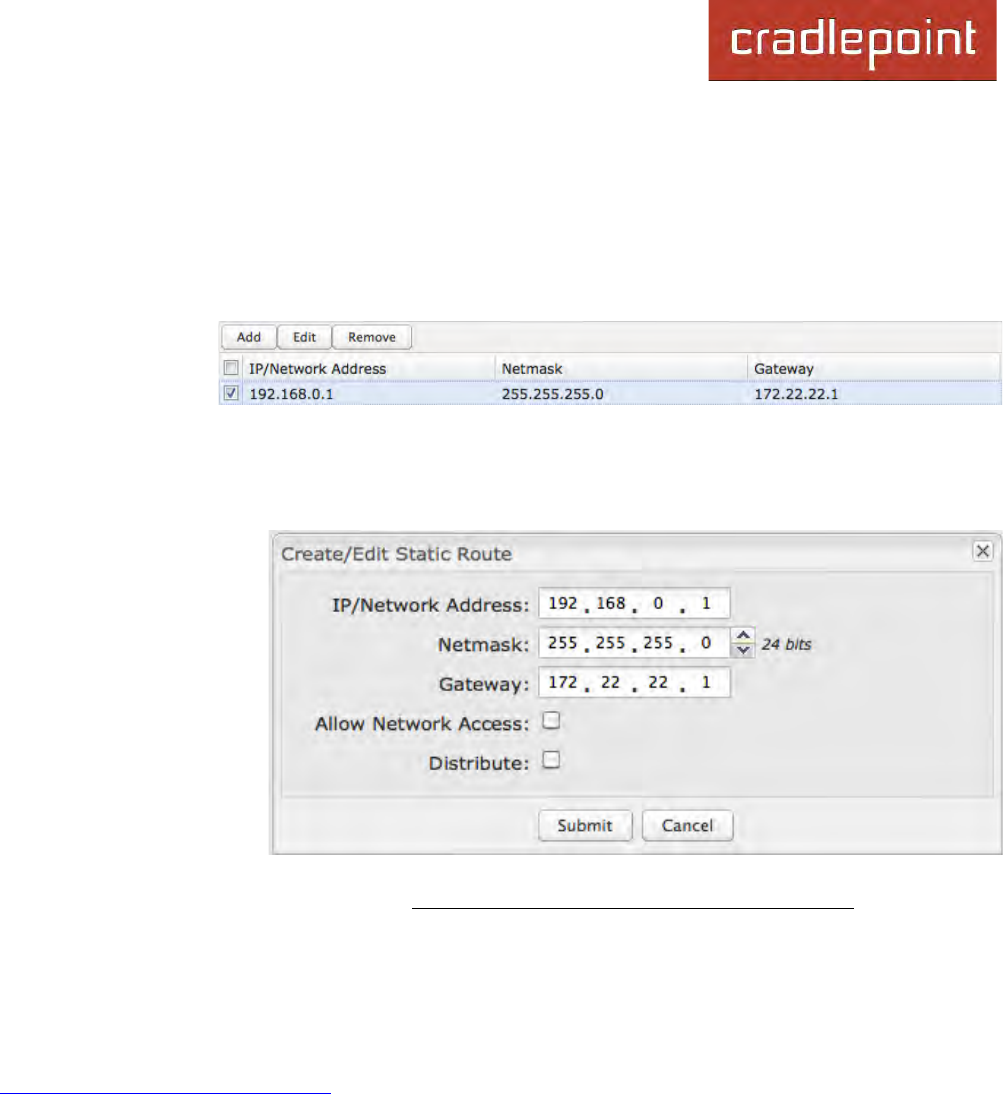 Add a new static route to the IP routing table or edit/remove an existing route.