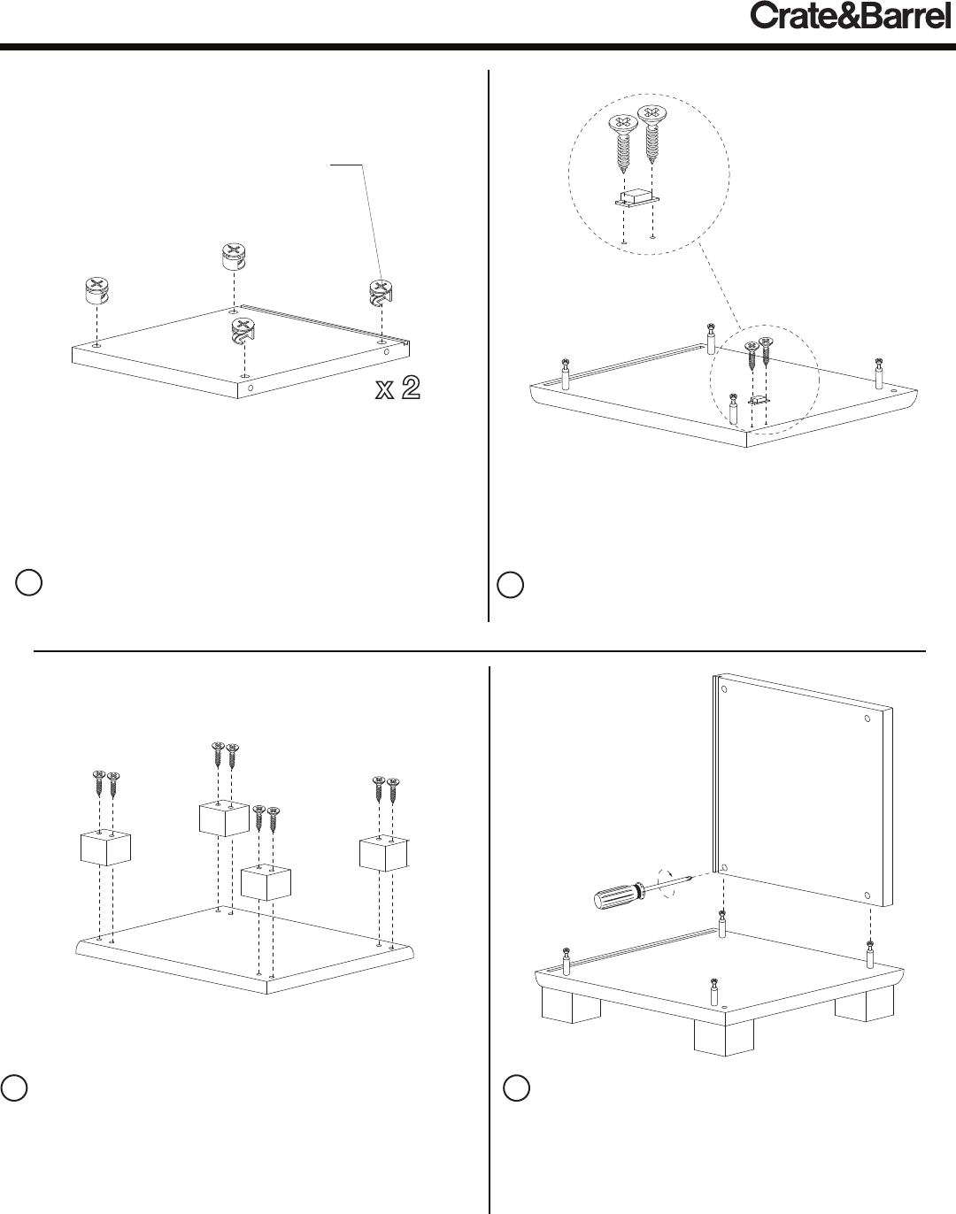 4 Attach 4 feet to bottom panel with 2 large screws per