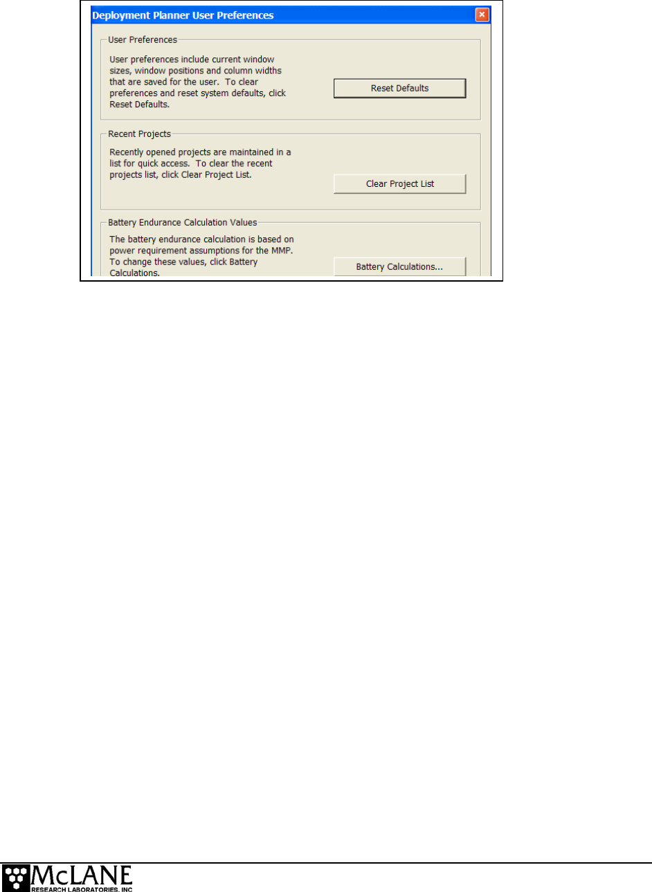 Preferences menu provides options that reset defaults including changing the battery endurance
