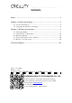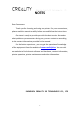 NOTES Dear Consumers: Thank you for choosing and using our printer. For your convenience, please read this manual carefully before use and follow the instructions. Our team is ready to provide you with the best service. No matter what problems you encounter during use, you can contact us according to the contact information provided in the manual. For the better experience , you can get the operational knowledge of the equipment from the website of www.creality3d.cn.