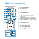 About Your Remote Control 3 About Your Remote Control Your remote control has an operating distance of up to three meters (approximately 9.8 feet). 1 Power/Standby button 2 Mute on/off button 12 1 3 Volume buttons 11 4 iPod Back/Menu button 2 5 iPod Navigation keypad 10 5a. 5b. 3 9 5c. 5d. 5e. 4 8 5 7 6 Broadcasting and Zone control buttons For use with X-Fi Wireless Receivers. See “Enabling wireless features” on page 11. 7 8 6 Scrolls up. Skips to the next track or fast-forwards a track.