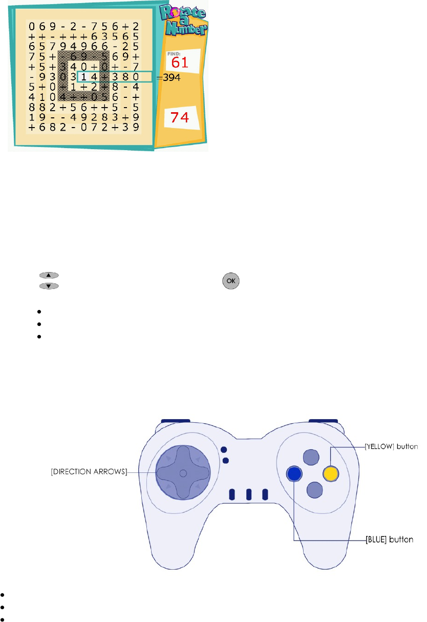 4 7 8 9. Select the 'ROTATE A NUMBER' game and set the different values (see page 11 for more
