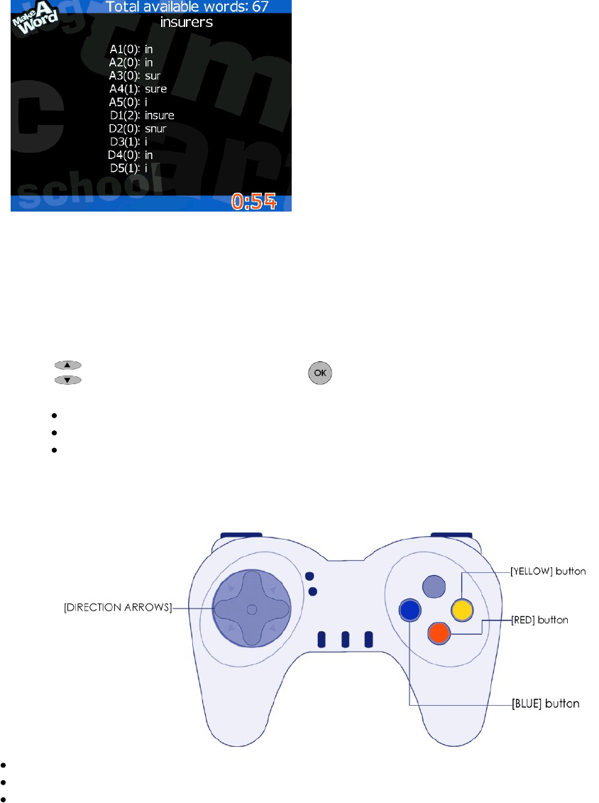 4 7 8 9. Select the 'MAKE A WORD' game and set the different values (see page 11 for more