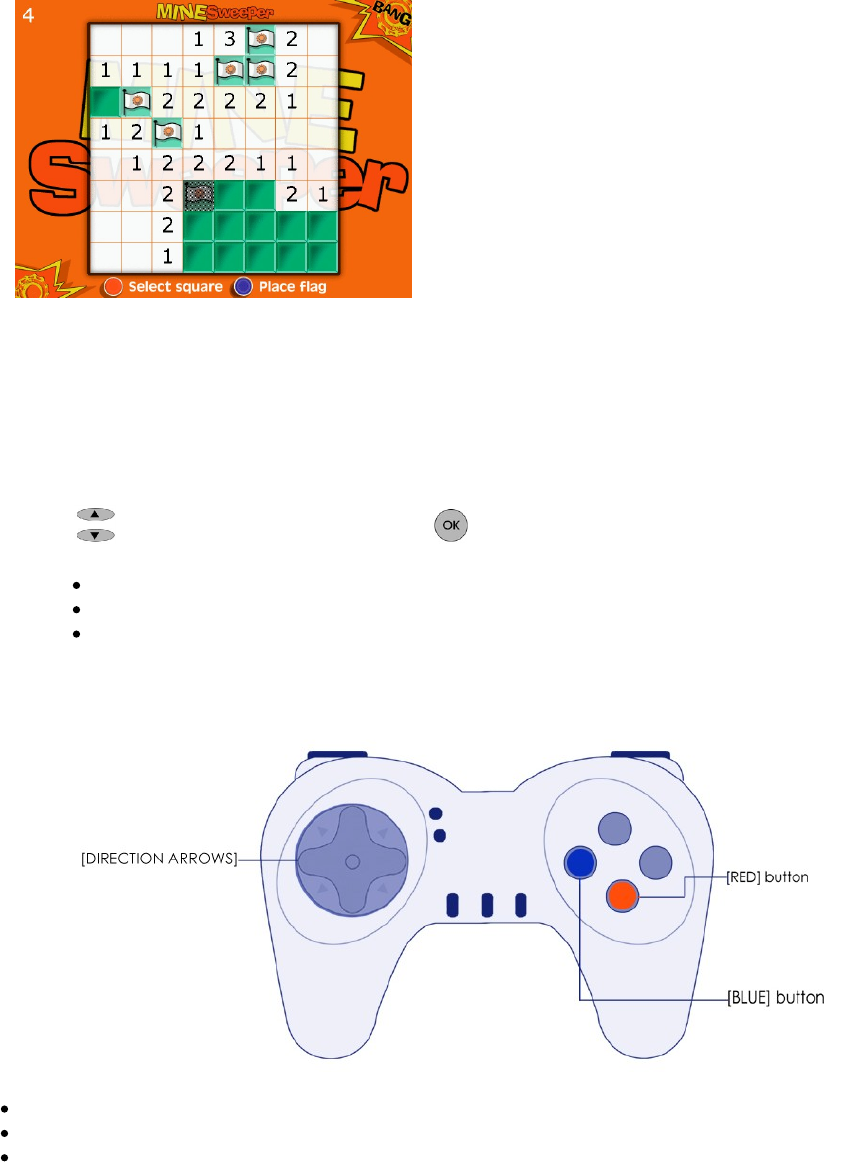 4 7 8 9. Select the 'MINESWEEPER' game and set the different values (see page 11 for more