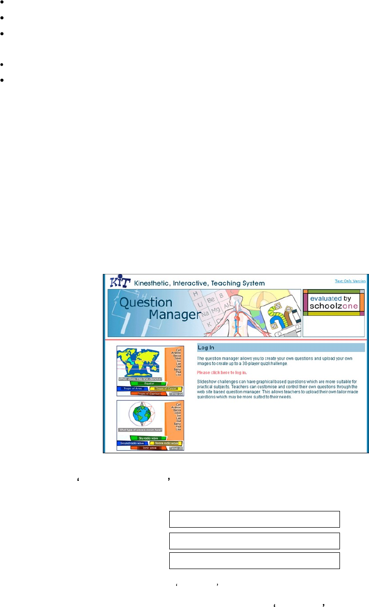 Questions/quizzes are created using the Question Manager and then saved onto a USB Storage Device (see page
