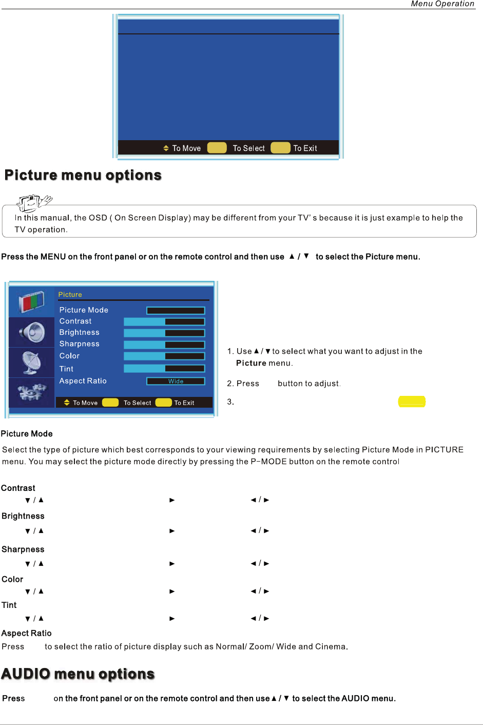Press button to select and press Enter / to enter, then press to adjust the tint of picture. (In NTSC system)