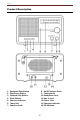 English Product Description 1. 2. 3. 4. 5. 6. 7. Backward Skip Button Play/Pause Button Forward Skip Button Mode Button Function Indicator Tuner Dial Function Knob 8. On/Off Volume Knob 9. Tuning Knob 10. Headphone Jack 11. Aux In Jack 12. Power Jack 13. Charging Indicator 14.