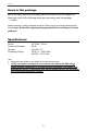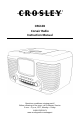 English Items in this package Before throwing away any packaging materials, please check thoroughly and make sure you find the following items that come along with this package: Radio Please contact Crosley customer service if there is any accessory missing from the package. Retain the original packaging materials for exchange or return purposes. Specifications Power Power consumption Speaker Frequency Range AC 120V ~ 60 Hz 20 W 4 Ω 5W, 2.5” FM 87.5 – 108.