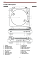English Product Description 1. 2. 3. 4. 5. 6. 7. 8. 9. Hinges 45 RPM Adapter Turntable Platter Turntable Spindle Size Selector Tonearm Hold Down Clip Speed Selector Start Button 10. Stop Button 11. Lift Button 12. Bluetooth Indicator 13. Bluetooth Button 14. Phone Line Switch 15. RCA Jack 16. Power Jack 17.