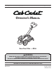 Safe Operation Practices • Set-Up • Operation • Maintenance • Service • Troubleshooting • Warranty Operator’s Manual Rear Tine Tiller — RT65 WARNING READ AND FOLLOW ALL SAFETY RULES AND INSTRUCTIONS IN THIS MANUAL BEFORE ATTEMPTING TO OPERATE THIS MACHINE. FAILURE TO COMPLY WITH THESE INSTRUCTIONS MAY RESULT IN PERSONAL INJURY. CUB CADET LLC, P.O. BOX 361131 CLEVELAND, OHIO 44136-0019 Printed In USA Form No.