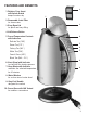 FEATURES AND BENEFITS 1. Dripless Pour Spout with Splash Guard keeps counters dry 2 1 2. Removable Scale Filter for clean water 3. Easy-Open Lid for quick and easy filling 3 4. Lid Release Button 5. Preset Temperature Controls with Indicators Delicate Tea (160°) Green Tea (175°) Oolong Tea (185°) White Tea (190°) French Press (200°) 4 5 6 7 Black Tea (Boil - 212°) 6. Start (Stop) with Indicator to start/stop the heating process 7.