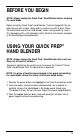 BEFORE YOU BEGIN NOTE: Always unplug the Quick Prep ® Hand Blender before cleaning the metal blade. Before using the Quick Prep® Hand Blender, Cuisinart suggests that you wipe the unit with a clean, damp cloth to remove any dirt or dust. Place the metal blade end of the hand blender under running water to rinse it. Dry thoroughly with a soft absorbent cloth. Read all instructions completely for detailed operating procedures.