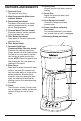 FEATURES AND BENEFITS 1. Reservoir Cover Flips back for easy filling. 2. Water Reservoir with Water Level Indicator Window 3. Showerhead (not shown) Distributes water evenly over coffee, reducing temperature loss as water passes through grounds. 4. Charcoal Water Filter (not shown) Eliminates chlorine, calcium and bad tastes and odors from water. 5. Filter Basket (not shown) Holds paper or Cuisinart® permanent gold-tone filters. 10. Heating Plate Scratch resistant with black, nonstick coating. 11.