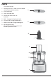 PIEZAS La máquina incluye: 1. Una base con un adaptador fijo y prácticos botones de control 7. 2. Tazón de 8 tazas (1.9 L) 3. Tapa con boca de llenado 4. Empujador 5. Cuchilla picadora/mezcladora/amasadora 6. Disco rebanador/rallador reversible fino 7. Disco rebanador/rallador reversible medio 6. 8. Sin BPA (no ilustrado) Ninguna de las piezas en contacto con los alimentos/líquidos contiene bisfenol A (BPA). 5. 4. 3. 2. 1.
