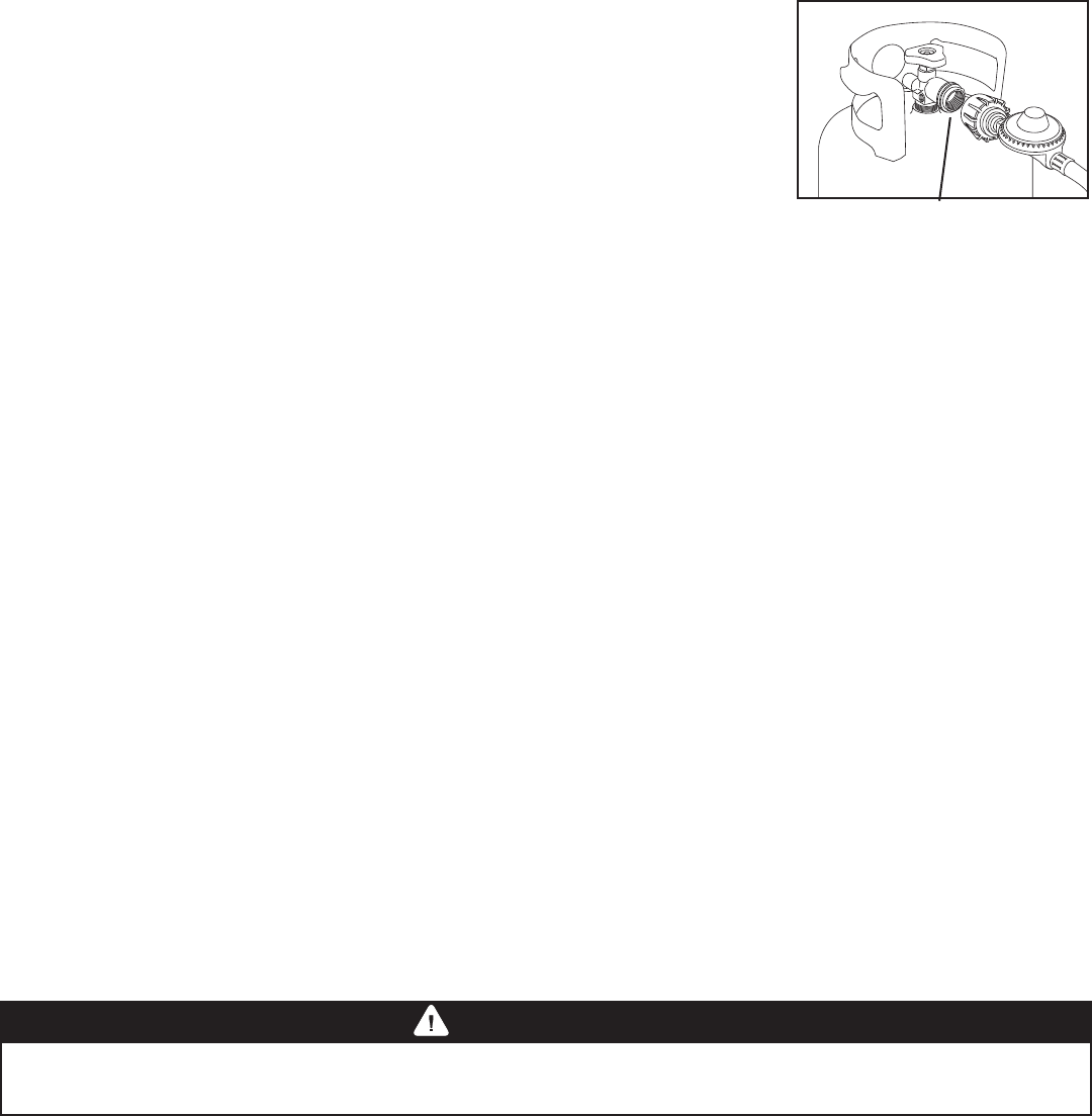 Note: To remove regulator from propane tank, turn off the tank valve and rotate the large coupling nut