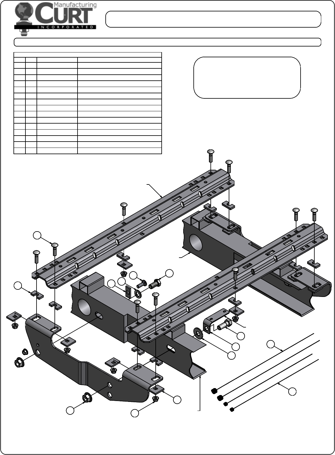 Curt Manufacturing Inc., may repair or replace the product, at their option, when the product is returned, prepaid, with proof of purchase. Alteration to, misuse of, or improper installation of