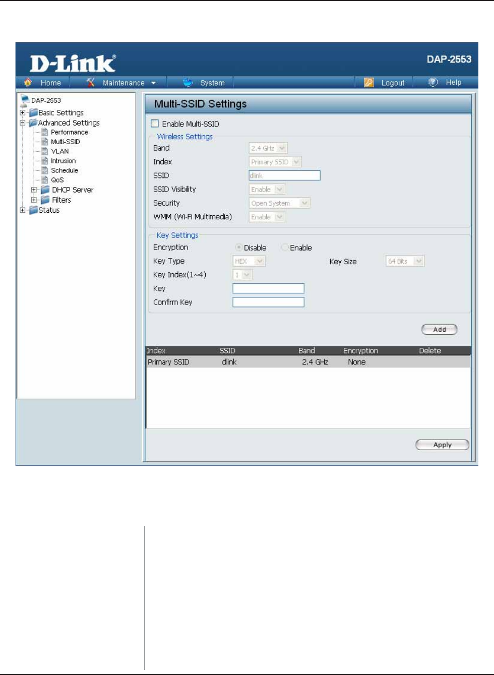 the Basic > Wireless section.The SSID’s factory default setting is dlink. The SSID can be easily