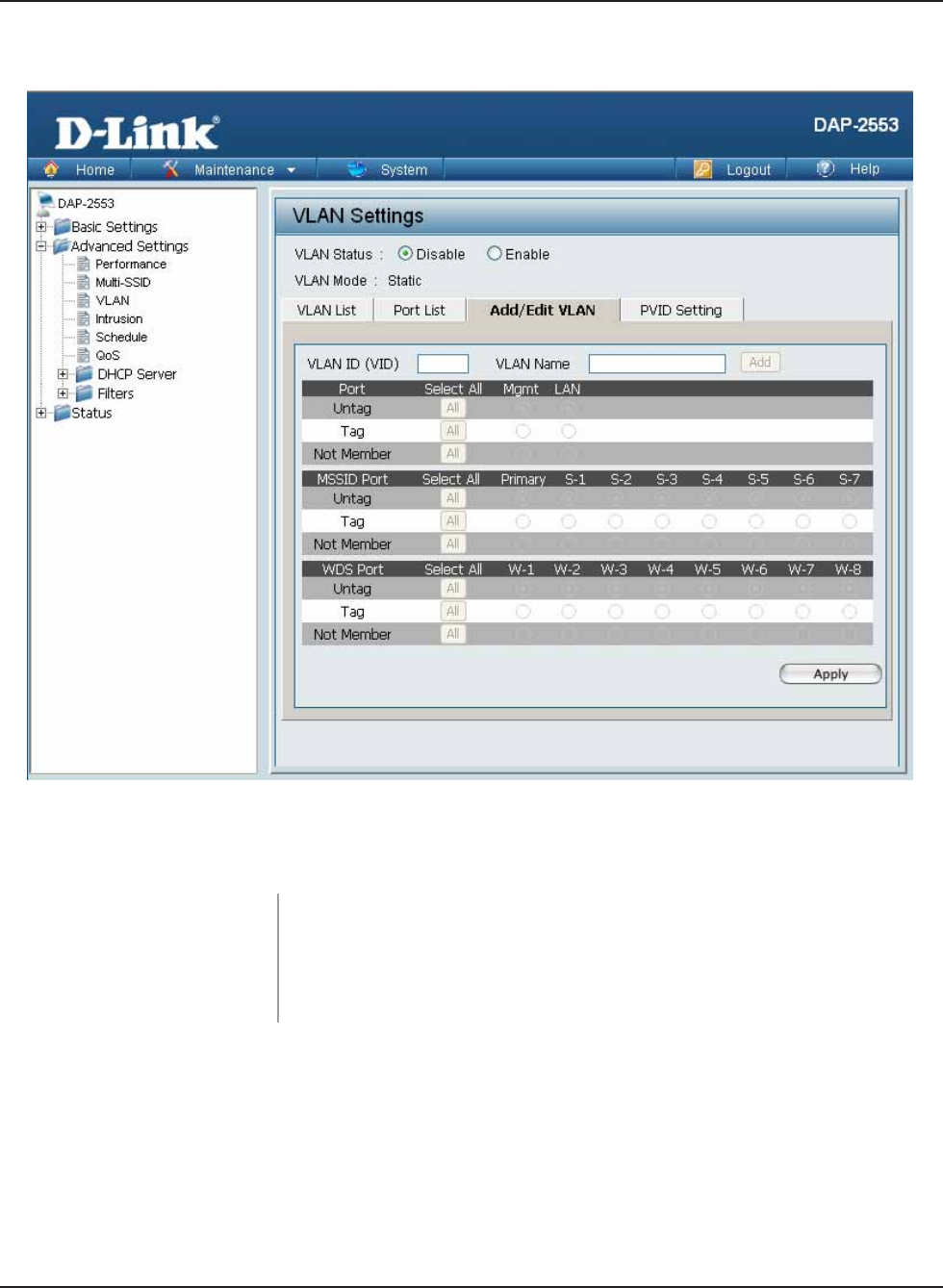 The Add/Edit VLAN tab is used to configure VLANs. Once you have made the desired changes,