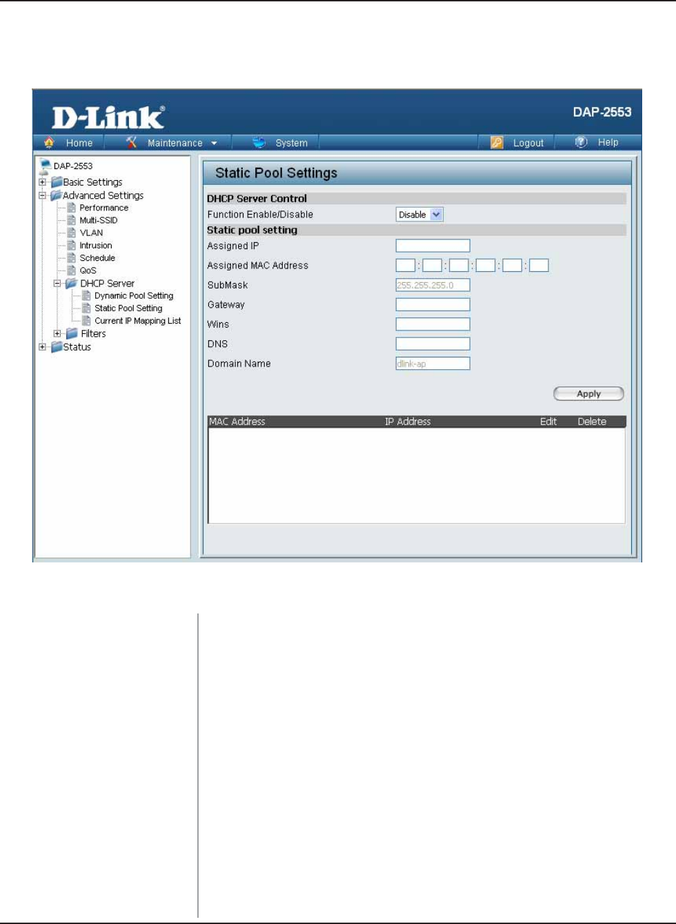 network. A static pool allows specific wireless stations to receive a fixed IP without time control.