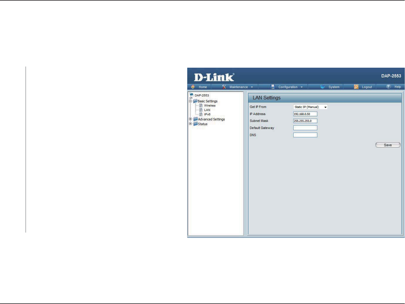 the DAP-2553. These settings may be referred to as private settings. You may change the LAN IP address if needed. The LAN IP