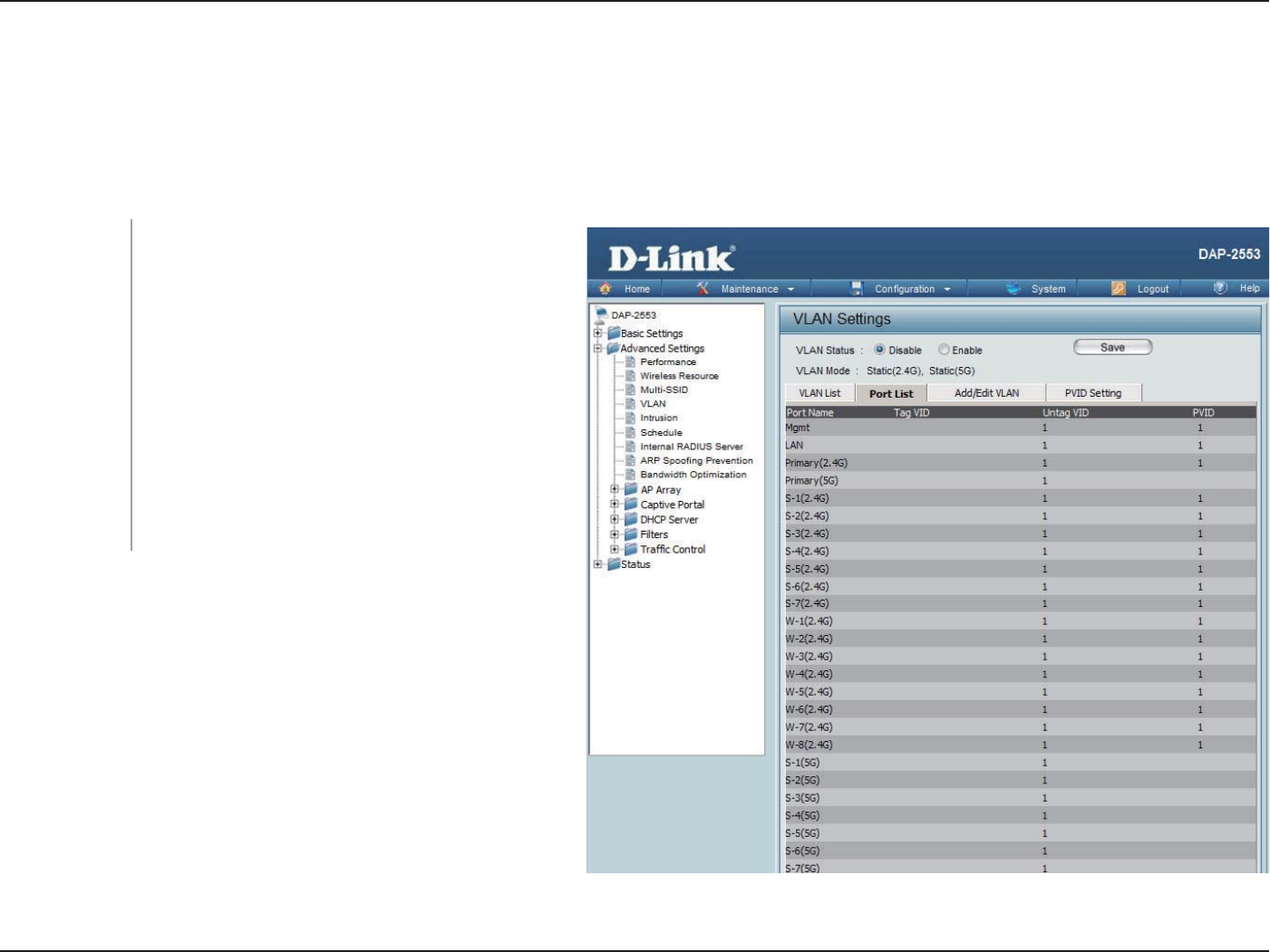 The Port List tab displays the current ports. If you want to congure the guest and internal networks on a Virtual LAN (VLAN),