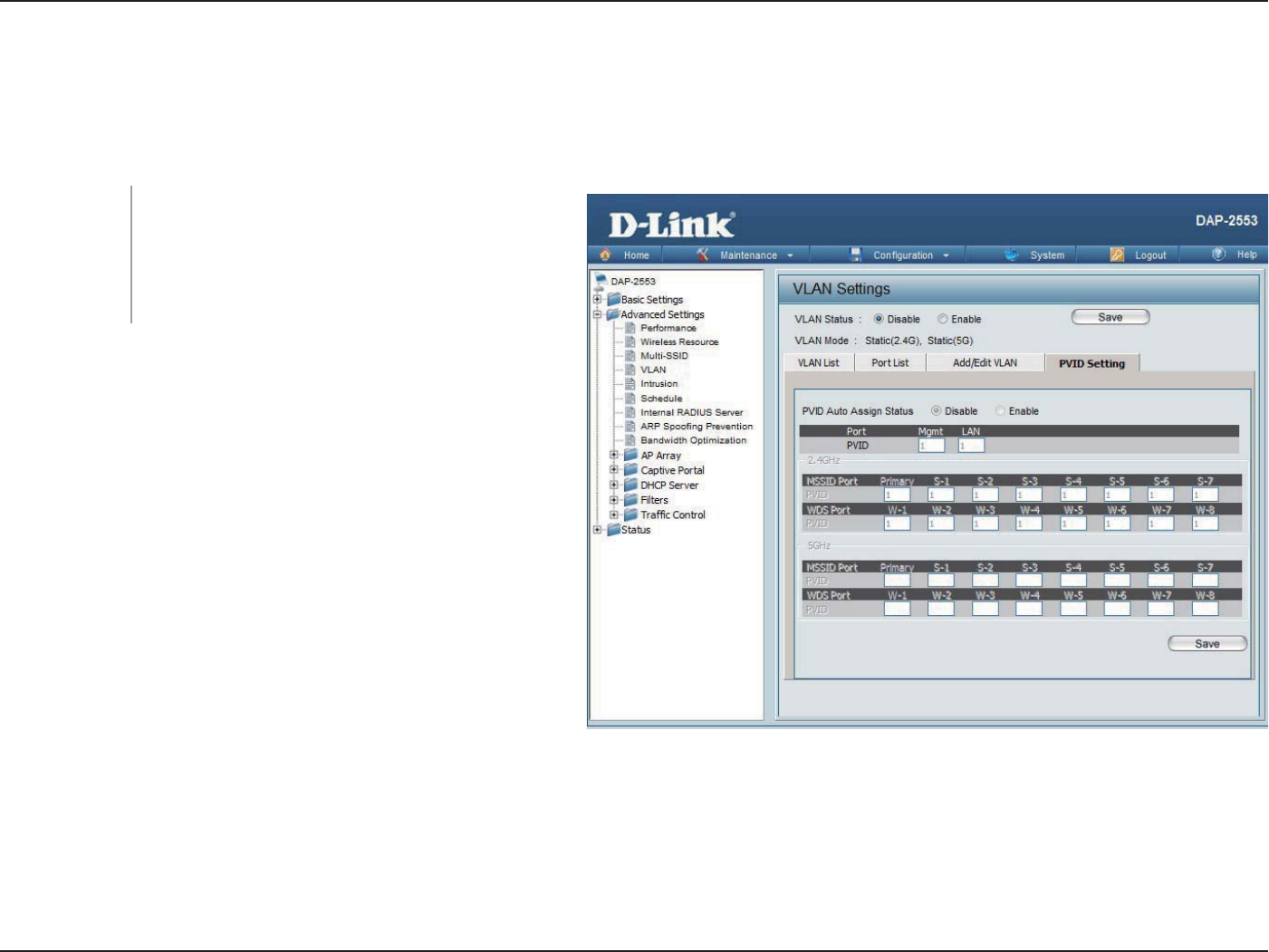 The PVID Setting tab is used to enable/disable the Port VLAN Identier Auto Assign Status as well as to congure various types