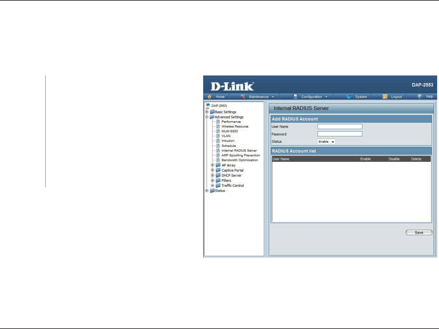 The DAP-2553 features a built-in RADIUS server. Once you have nished adding a RADIUS account, click the Save button to let