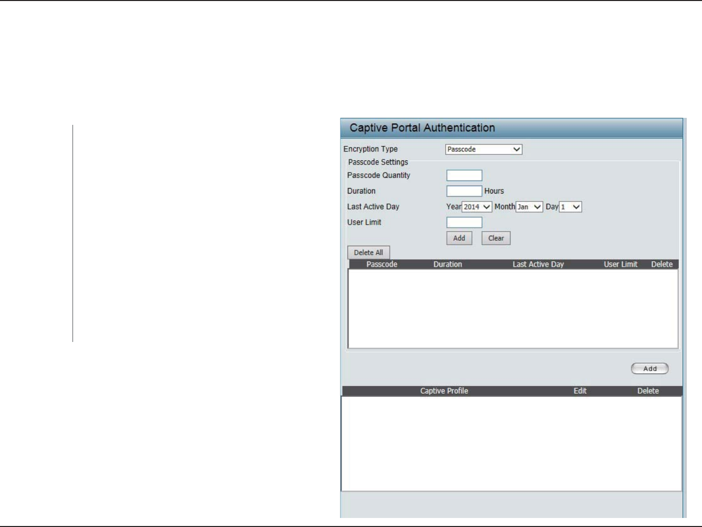 to a web authentication page. In this windows, user can view and congure the Captive Portal settings. Click the Add button