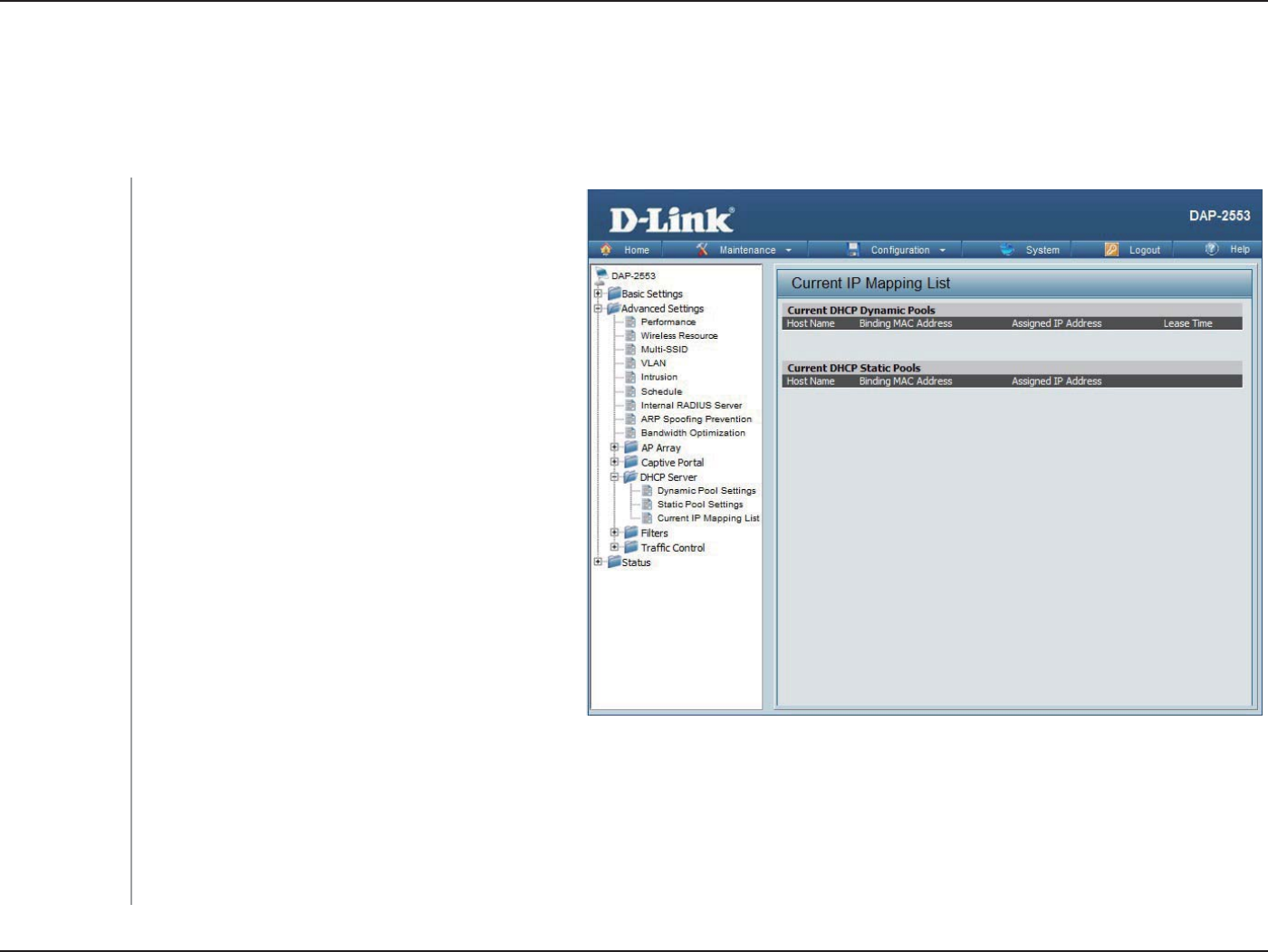 This window displays information about the current assigned DHCP dynamic and static IP address pools. This information is