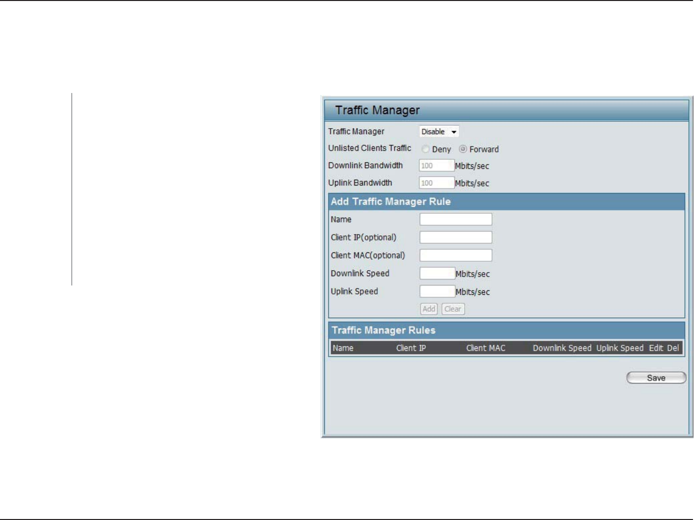 and specify downlink/ uplink speed for new trac manager rules. Click the Save button to let your changes take eect.