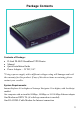 Package Contents Contents of Package: • • • • D-Link DI-804V Broadband VPN Router Manual Quick Installation Guide Power Adapter - 5V DC, 2A* *Using a power supply with a different voltage rating will damage and void the warranty for this product. If any of the above items are missing, please contact your reseller System Requirements: Internet Explorer 4.0 or higher or Netscape Navigator 4.