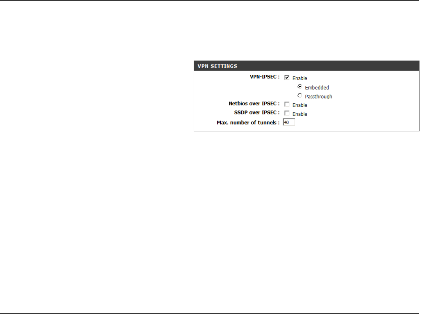 This section will help you create and congure your VPN settings. The router supports IPSec as the Server Endpoint. IPSec (Internet