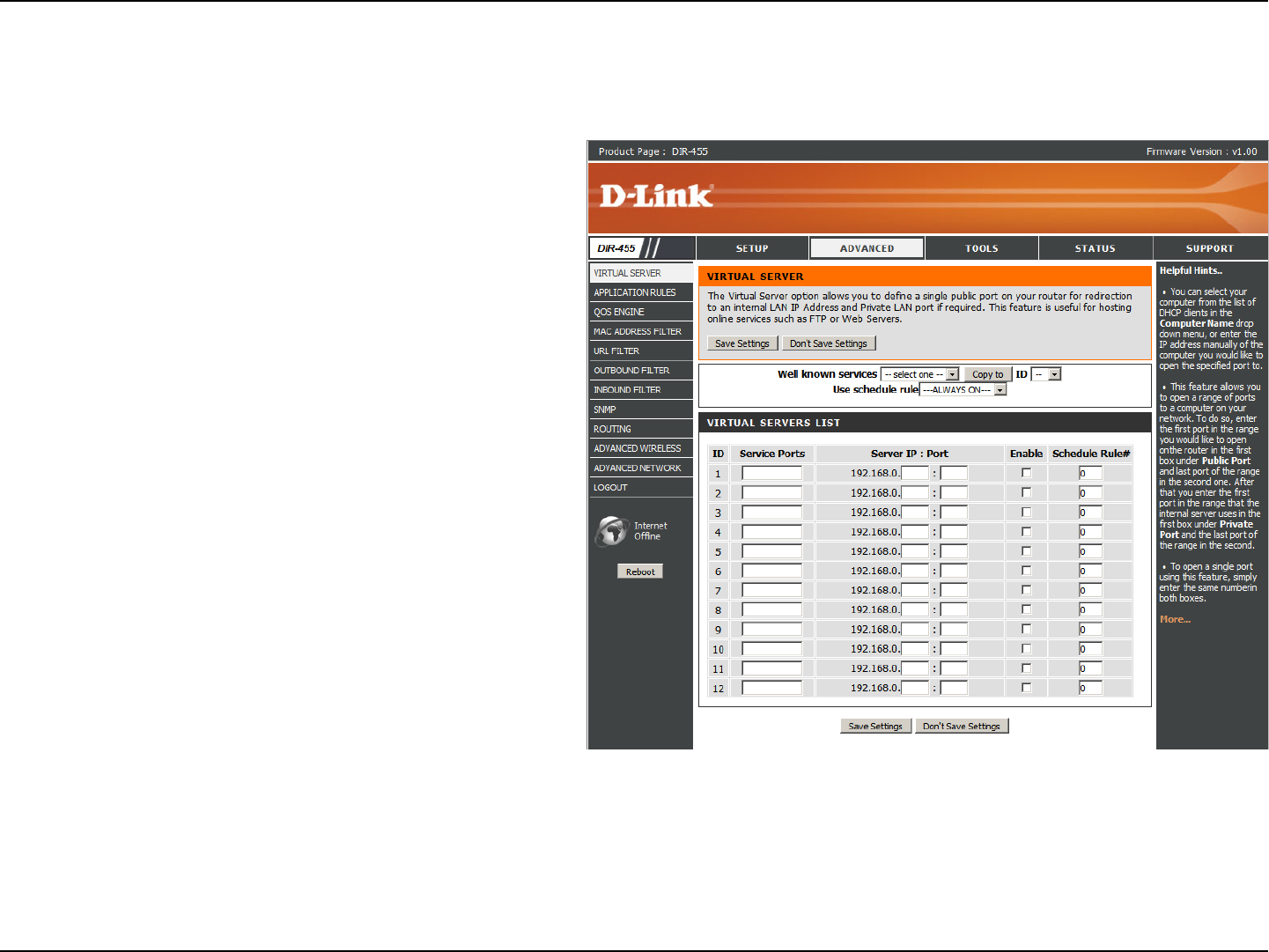 The device can be congured as a virtual server so that users can access services such as Web or FTP via the public (WAN) IP address
