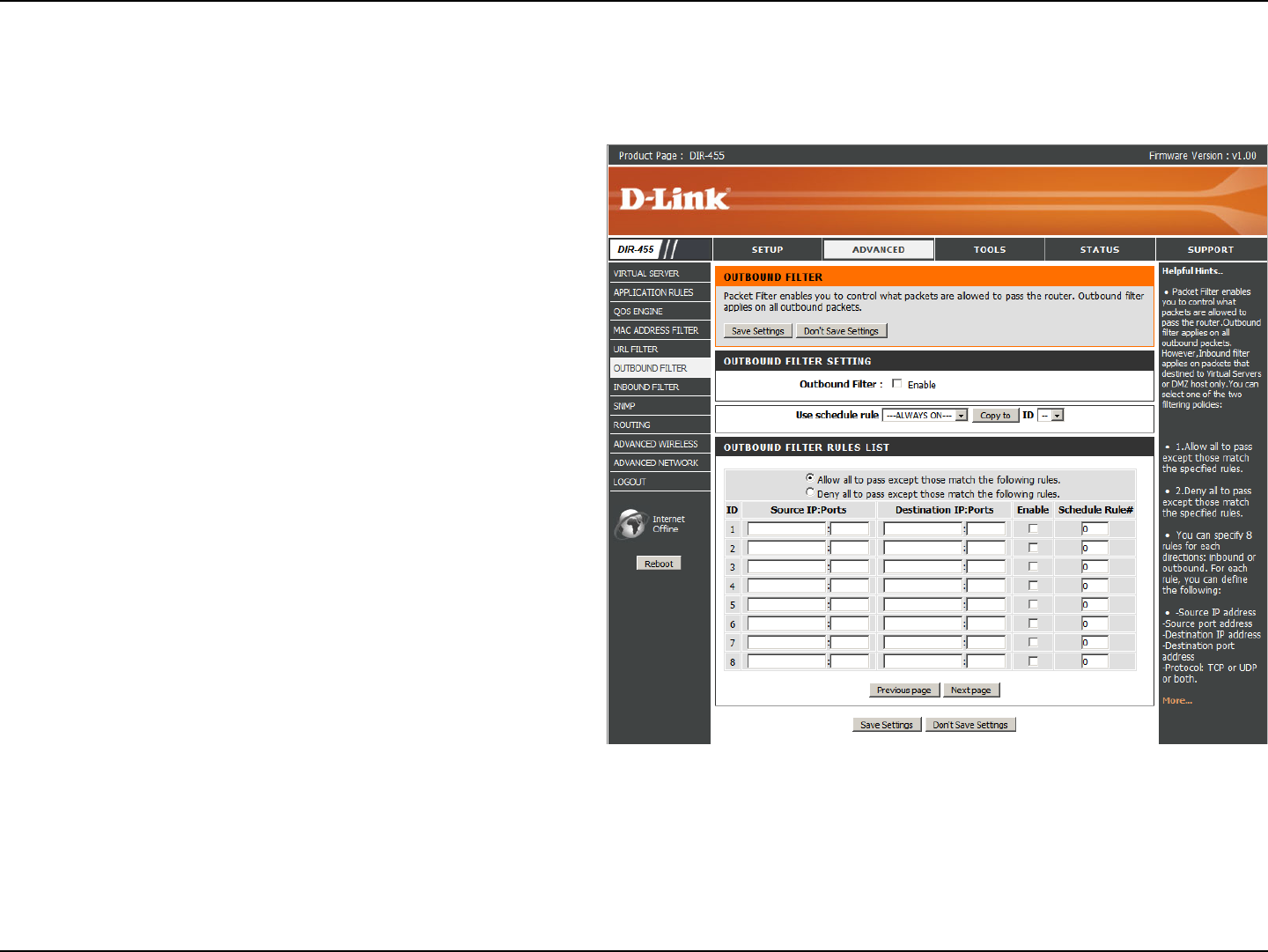 Outbound Filter enables you to control what packets are allowed to pass the router. Outbound lter applies on all outbound packets.