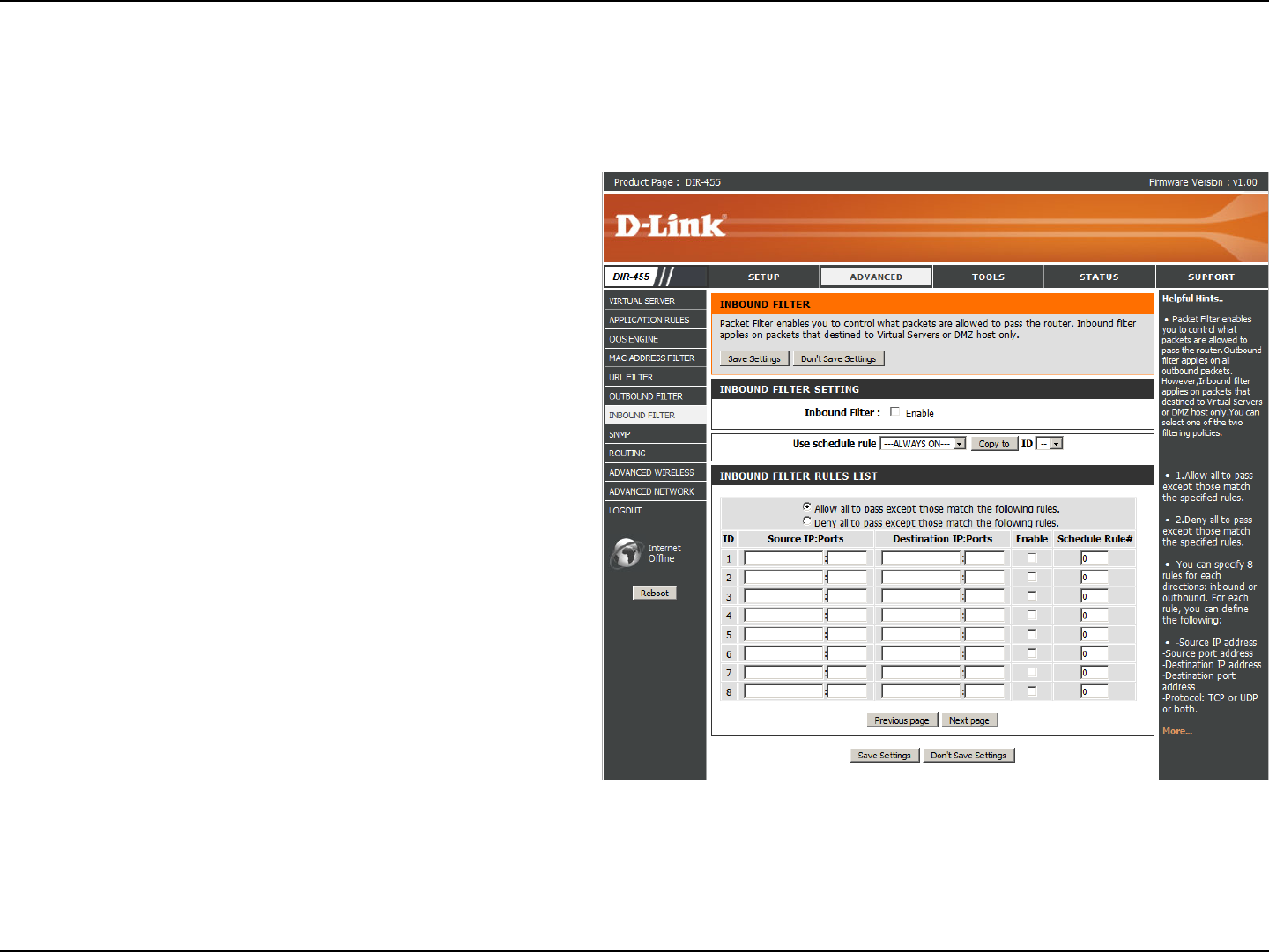 Inbound Filter enables you to control what packets are allowed to pass the router. Inbound lter only applies to packets that are destined