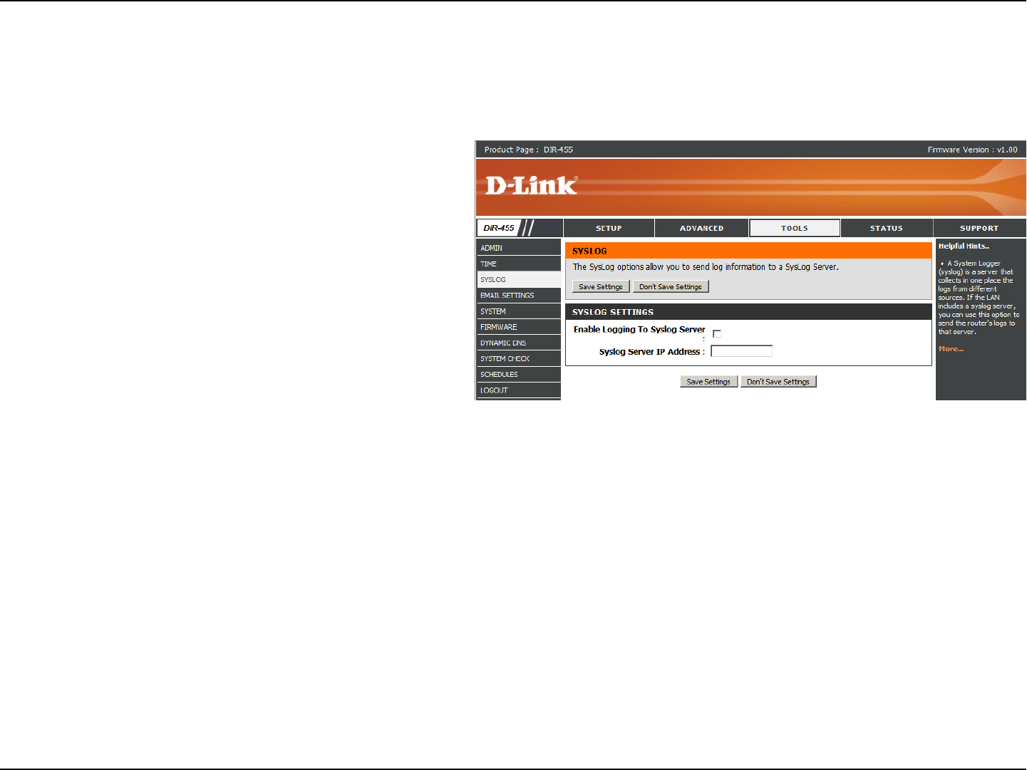 The DIR-455 keeps a running log of events and activities occurring on the router. You may send these logs to a SysLog server on your