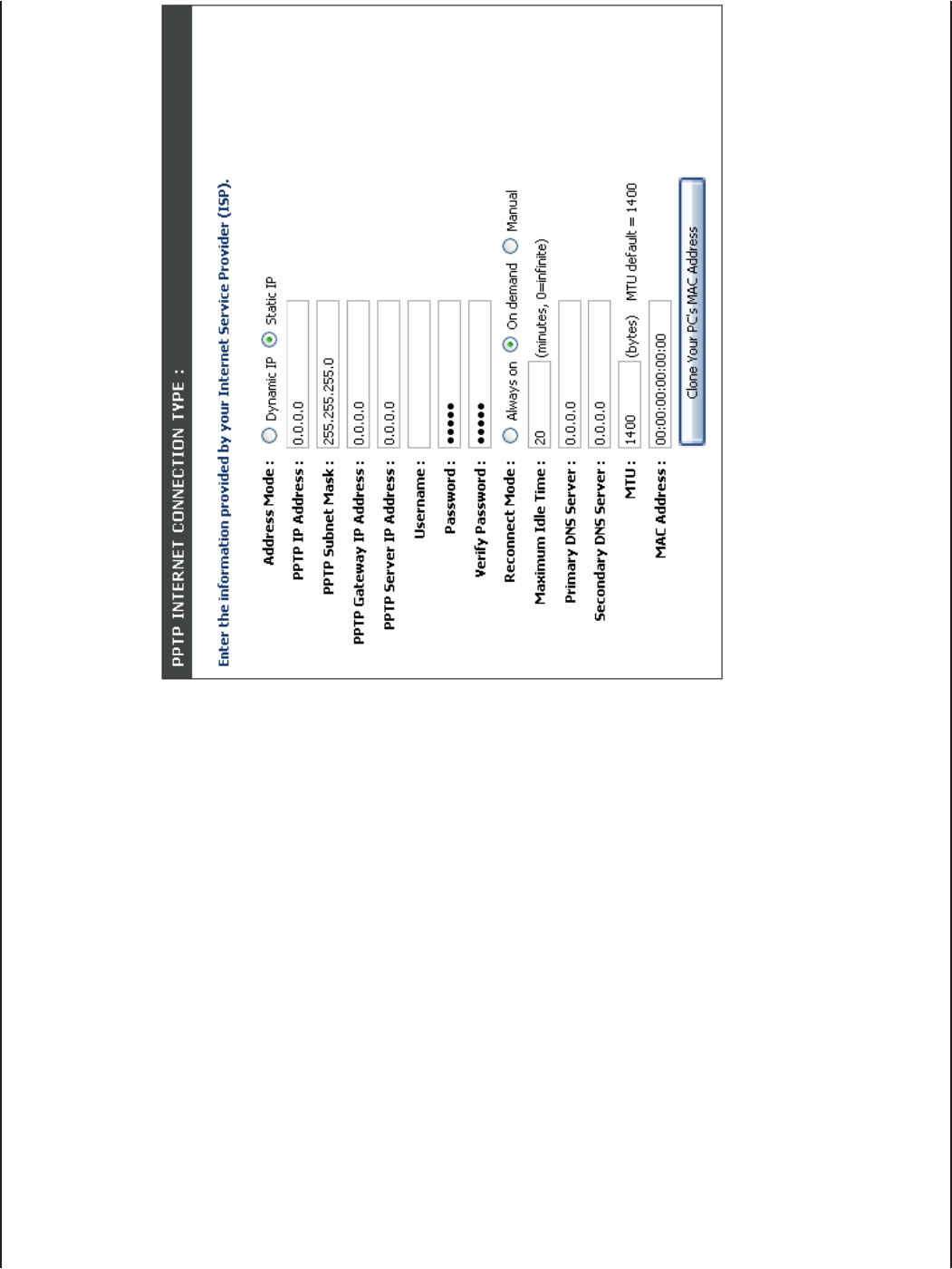 Choose PPTP (Point-to-Point-Tunneling Protocol ) if your ISP uses a PPTP connection. Your ISP will provide you with