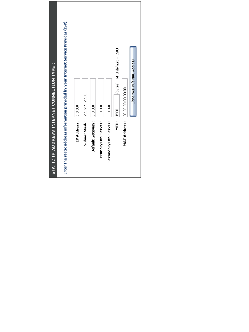 Select Static IP Address if all the Internet port’s IP information is provided to you by your ISP. You will need to enter in the IP address,