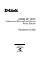DP-301P Print Server Hardware Guide 0 A BOUT THIS G UIDE This guide describes the D-Link DP-301P Multiprotocol Ethernet/Fast Ethernet Print Server. DP-301P features, installation procedures, and troubleshooting methods are explained in detail. The software and related documentation included with your DP-301P are important parts of the DP-301P package. For information on installing and using the included software, see the PS Admin User’s Guide.