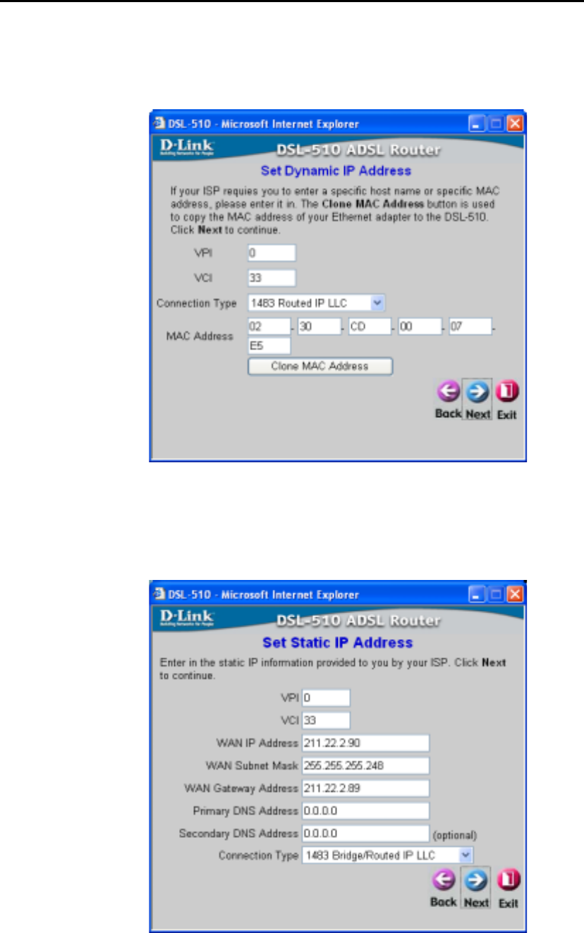 If your selected Dynamic IP Address, you will see the following page. You will need to enter in VPI, VCI and select